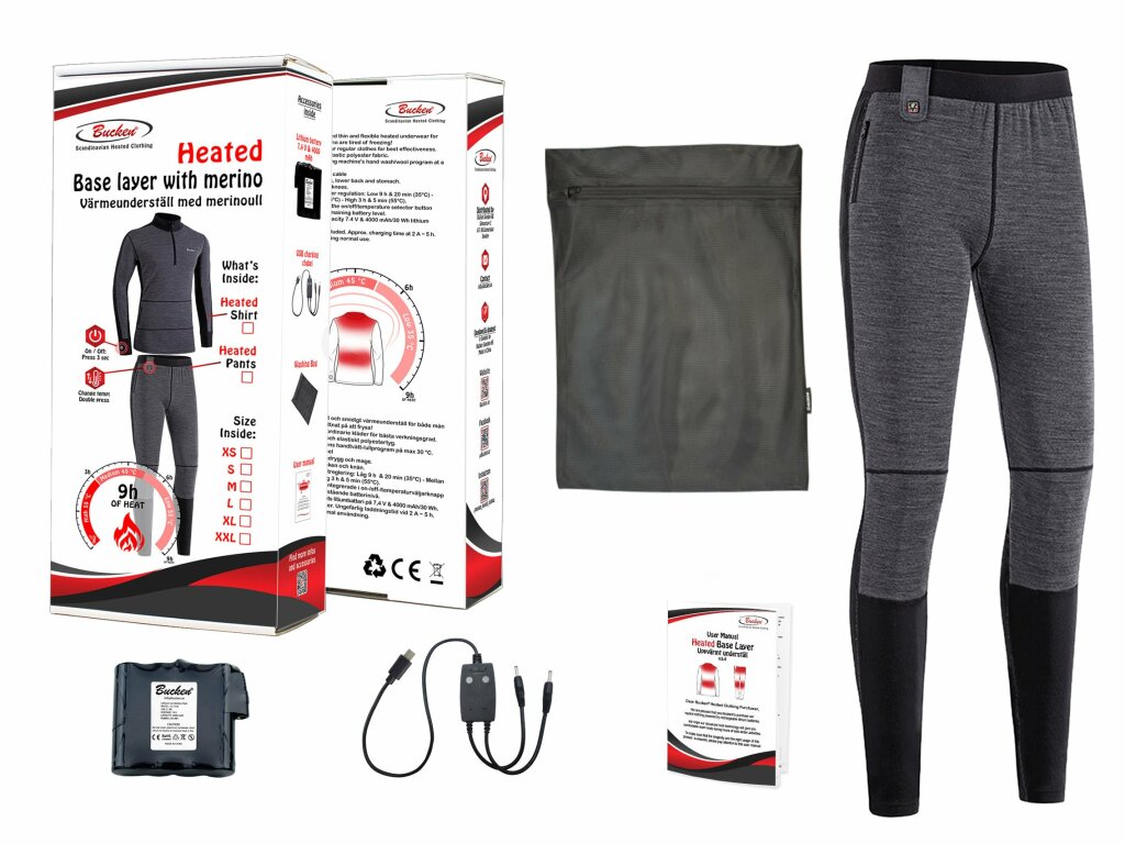 Enten du fryser innendørs eller skal ut i kulden, kan Bucken® oppvarmede lange underbukser med merinoull være den perfekte løsningen for deg. Ett enkelt knappetrykk er nok til å aktivere varmesystemet og deilig varme sprer seg. Avhengig av valgt varmenivå er batteritiden 4-10 timer per lading. Understellsbuksen er tynn og kan dermed bæres under dine vanlige favorittklær for best mulig effekt.