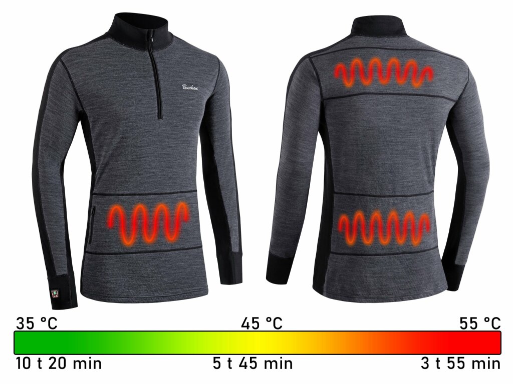 Enten du fryser innendørs eller skal ut i kulden, kan Bucken® oppvarmet undertrøye med merinoull være den perfekte løsningen for deg. Ett enkelt knappetrykk er nok til å aktivere varmesystemet og deilig varme sprer seg. Varmesystemet gir varme i 4–10 timer per lading, avhengig av hvor varmt du ønsker det. Varmetrøyen er veldig tynn og kan dermed bæres under dine vanlige favorittklær for best mulig effekt.